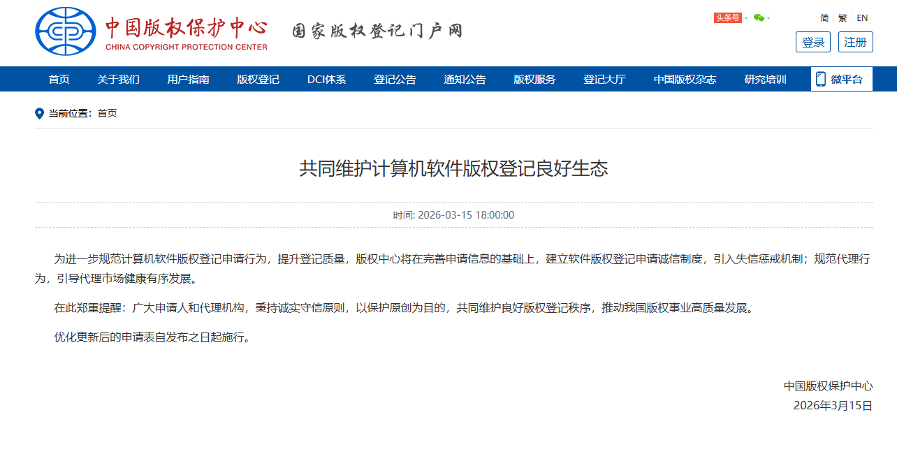 中国版权保护中心于2026年3月15日发布《共同维护计算机软件版权登记良好生态》并实施优化更新后的申请表。